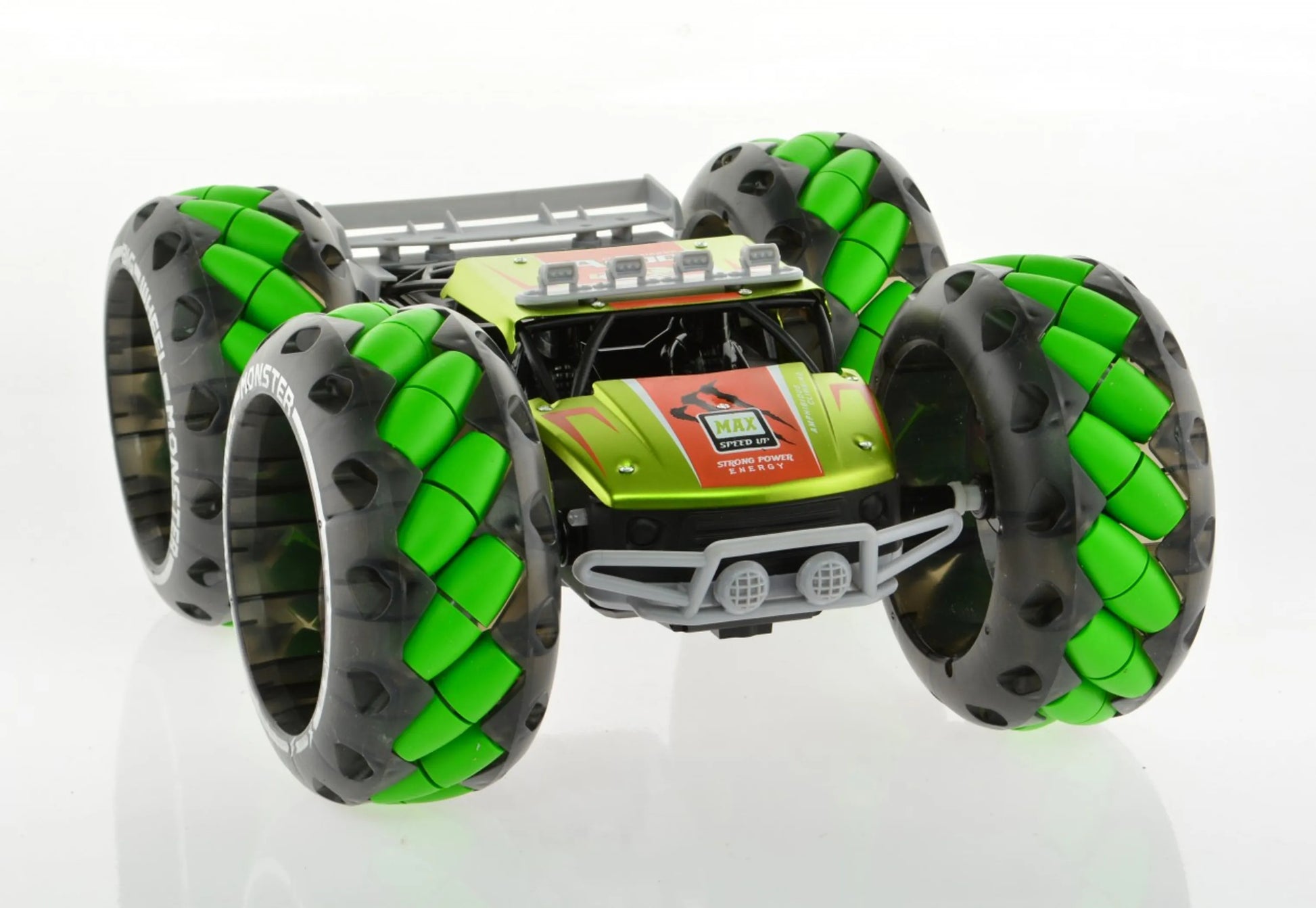1:12 scale 4WD truck with huge wheels a metal body and exceptional paint job. The truck has 2 remotes a standard remote and a gesture remote that controls the truck with wrist movement. The truck can be driven forward, reverse, turn right and left, spin and drive sideways left and right. The truck has special tires that give it exceptional grip and it can climb very steep slops. 2.4 GHz allows to race up to 50 of these at the same time with no interference. the range is 150 feet and the truck has top speed just under 10 MPH. The truck has demo mode that is programmed to show what the truck can do.
