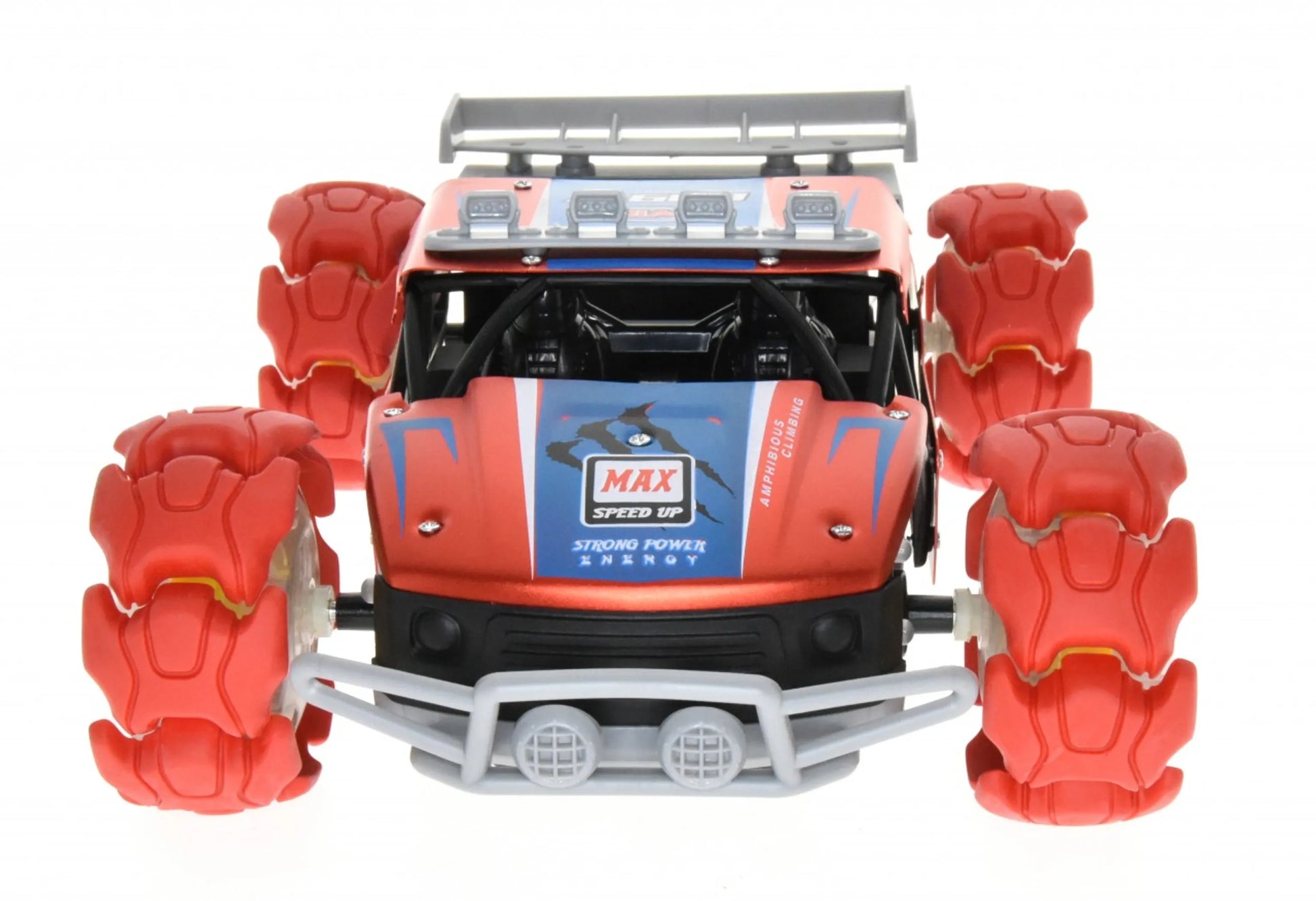 1:12 scale 4WD truck with wheels that expand at high speed, a metal body and exceptional paint job. The truck has 2 remotes a standard remote and a gesture remote that controls the truck with wrist movement. The truck can be driven forward, reverse, turn right and left and spin. The truck has special tires that give it exceptional grip and it can climb very steep slops. 2.4 GHz allows to race up to 50 of these at the same time with no interference. the range is 150 feet and the truck has top speed just under 15 MPH. The truck has demo mode that is programmed to show what the truck can do.