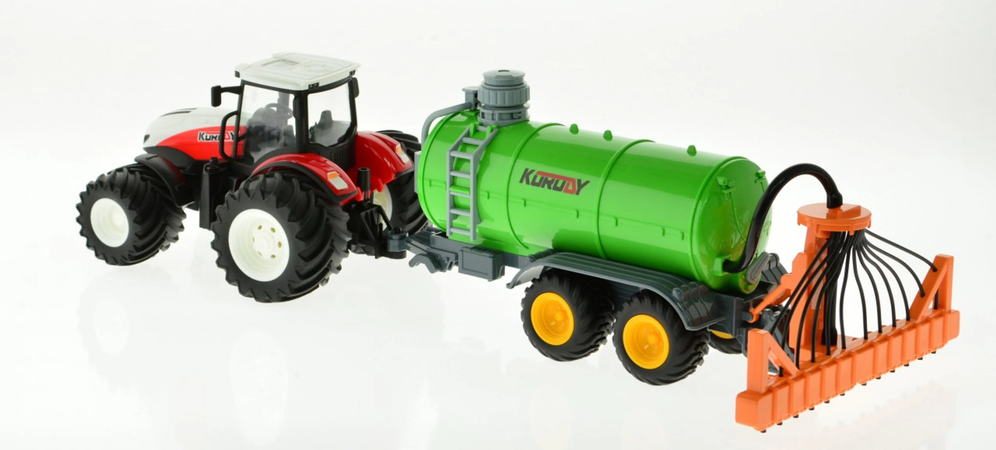 1:24 scale 4 big wheel tractor with working fertilizer tank. fill it with water pressurise it with the pump and it will spread the water through the pipes. 2.4 GHz remote allow to drive up to 50 of these at the same time with no interference and rechargeable batteries give up to 30 minutes of play time per charge.